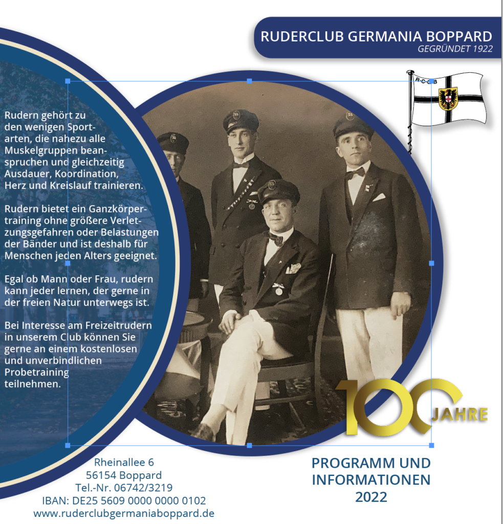 V. l.: Lennart Michealis, Kent Michaelis, Jörg Haseneier, Ingmar Flach, Moritz Petri, Willi Rüdel, Jutta Galeazzi Boppard. Ein Traditionsverein feiert 100 Jahre: 1921 wurde der Ruderclub Germania Boppard erstmals in der Bopparder Stadtzeitung erwähnt, 1922 war dann das Jahr der Vereinsgründung. In den Anfangsjahren hatte der Ruderclub eine kleine Halle mit Schuppen auf dem Gelände